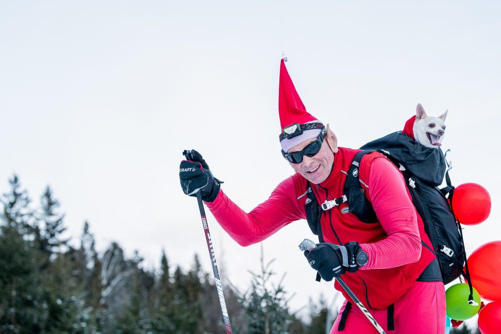 Ce skieur de renommée internationale, c’est Phil Shaw, qui trimbale souvent son chien sur son dos et traîne une charge, que ce soit une paire de vieux skis ou encore, un sapin durant le mois de décembre.